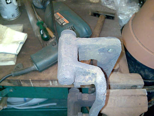 | Bild 6 Der entrostete und mit Rostschutzlack behandelte Bremssattelträger (siehe auch Vorderachse). Die Führungsnasen und die Gummimanschetten werden nach dem Lackieren mit Hilfe von Bremsenreiniger gleich wieder vom neuen Lack befreit.
