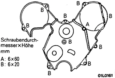 Jetzt kommen die Abdeckungen wieder drauf. Diese vorher innen reinigen und nochmal die Gummilippen kontrollieren. Falls die Schrauben durcheinander gefallen sind: auf dem Bild sieht man nochmal genau, welche wohin gehören.Jetzt kommt die Schraube wieder aus der Kurbelwelle raus, die Aluscheibe und die Riemenscheibe wieder drauf und die Schraube wieder rein. |